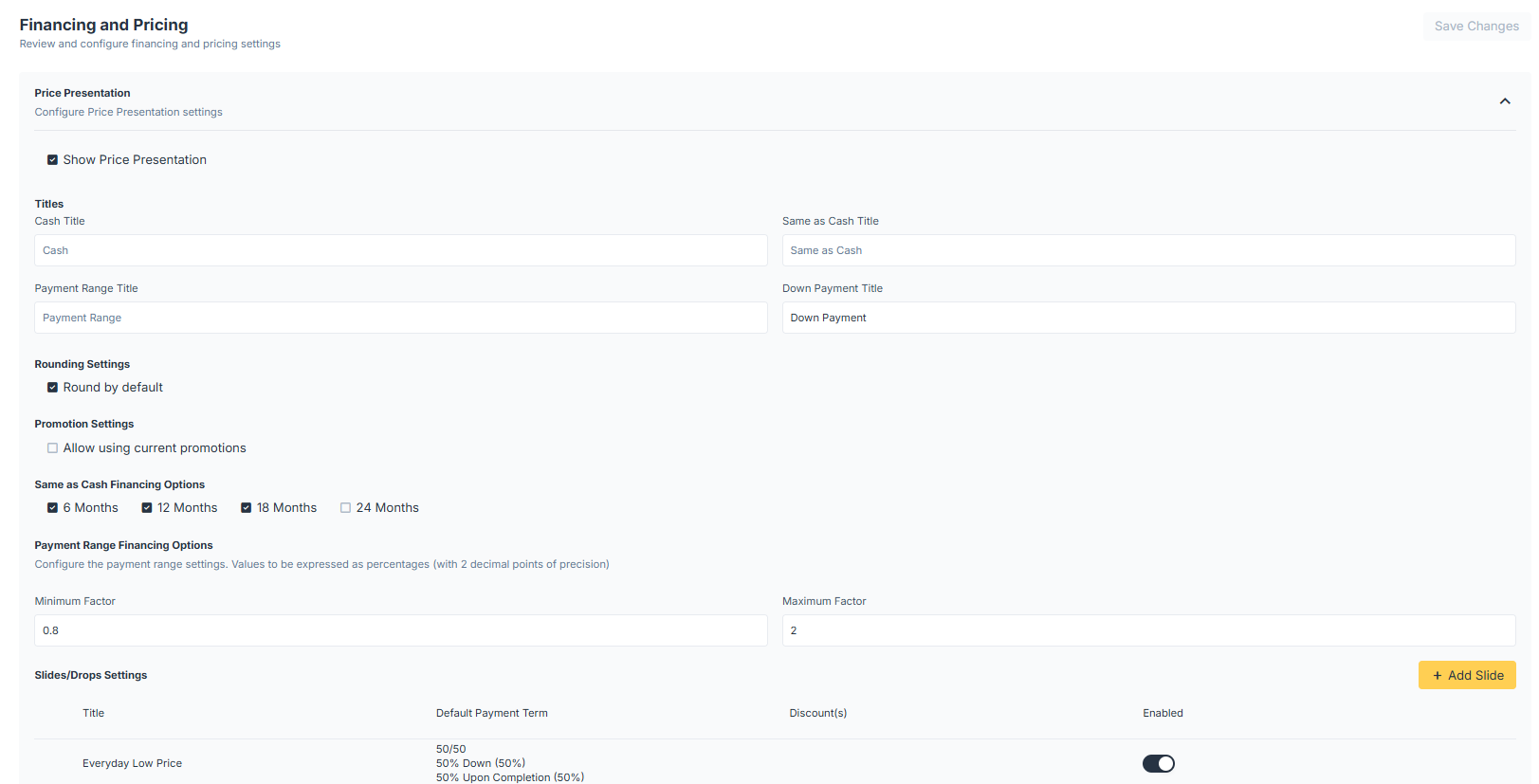 Slides/Drops Settings: Where the user determines slide titles, which payment terms and discounts should be applied to that slide, and whether or not that slide is currently enabled for sales reps. These settings will apply to all price presentations.