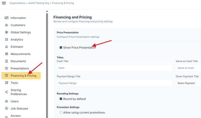The Enhanced Price Presentation allows organizations to standardize how pricing, financing, and discounts are displayed during customer presentations. Configuration is completed in the Administration panel and applies to all price presentations within the organization.