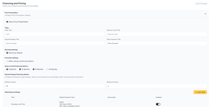 Payment Range Financing Settings: Determines the min and max payment range factors (%s). The range will take the total price after discounts and multiply by these factors to get the range.