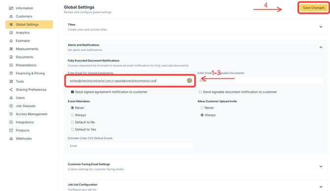 Alerts and Notifications send email updates when documents such as signed agreements are completed. Notification recipients can be managed from Global Settings in the Administration Dashboard. Email addresses added here do not need to be active OCC seat users.