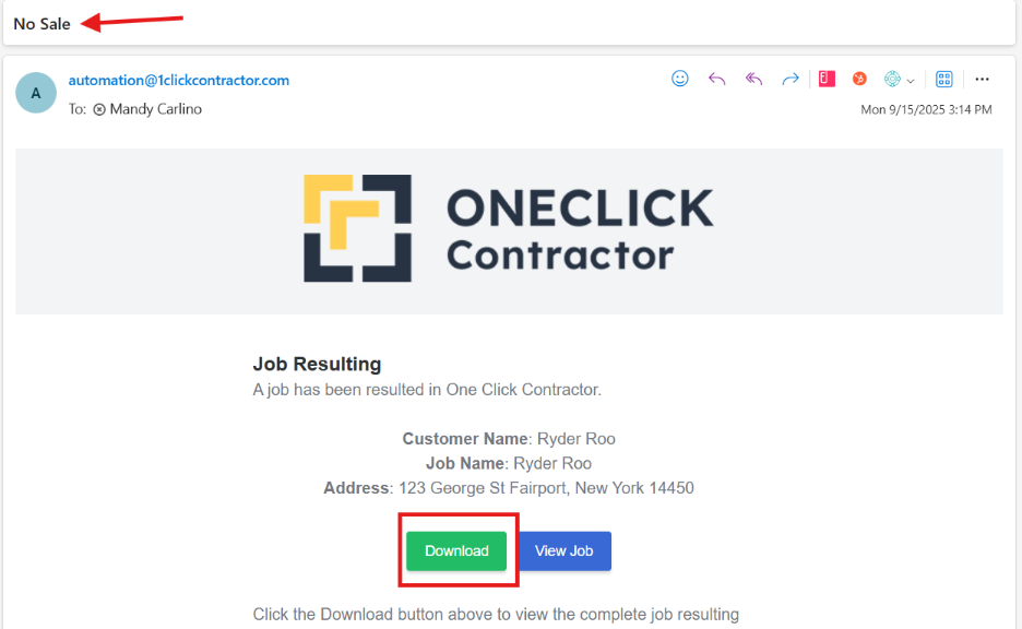Submission triggers the email, where the user will see the configured Subject Line and options to Download the resulting (which will show the resulting via the Pattern that was configured) and to view the job: