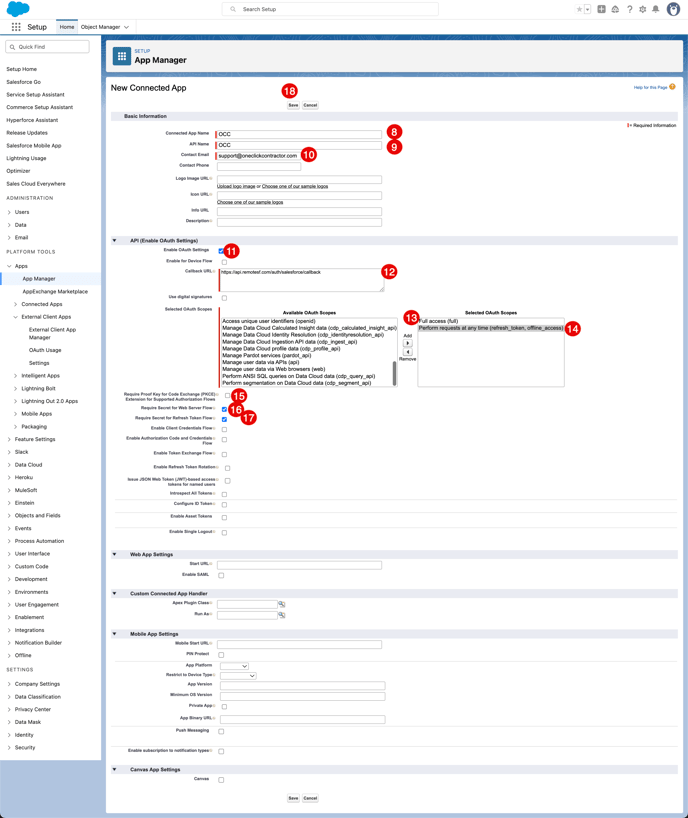 7. From the "New Connected App" screen, under the "Basic Information" enter "OCC" in the Connected App Name box
