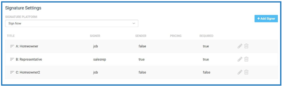 The “Signer” column choices are “job” or “salesrep”. The “job” is the customer and “salesrep” is the representative.