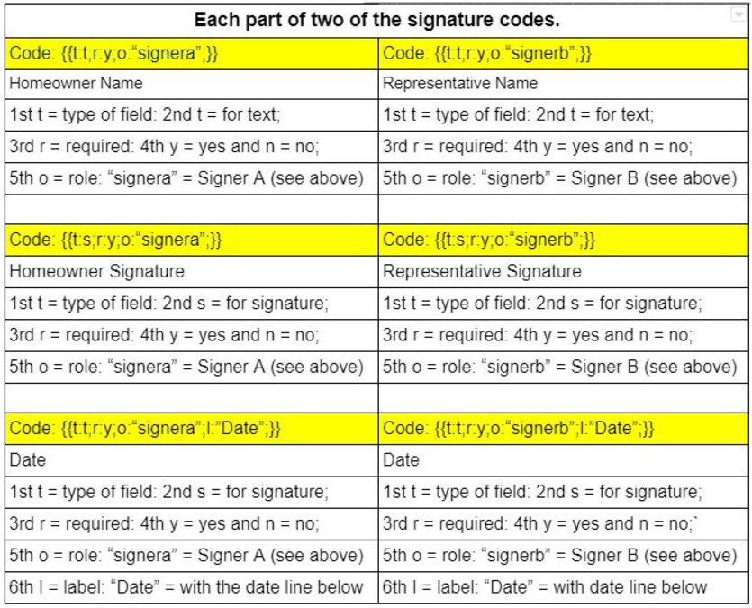 Once you have finished the fillable sections. Now it is time to code for signatures. The following image is an example of name, signature, and date lines as well as the coding behind the scenes. In the code, a “:” (colon) means a relation between the 2 codes, a “;” (semi-colon) signifies the next part of the code and “signera” or “signerb” identifies the corresponding party in the Signature Settings box below.